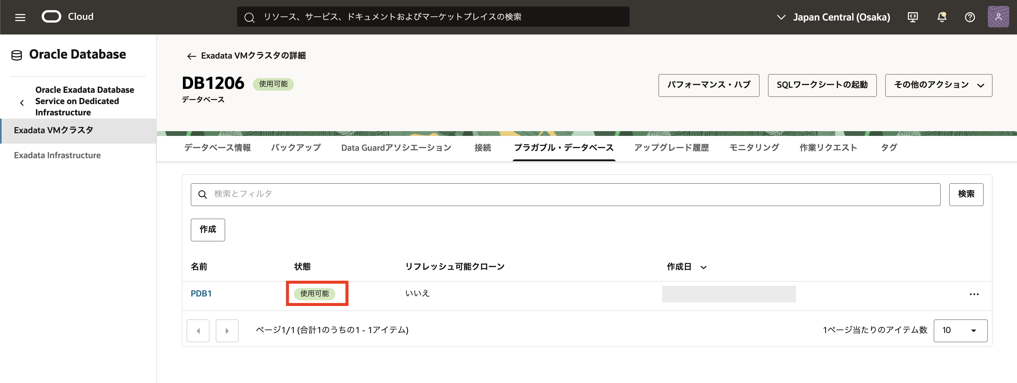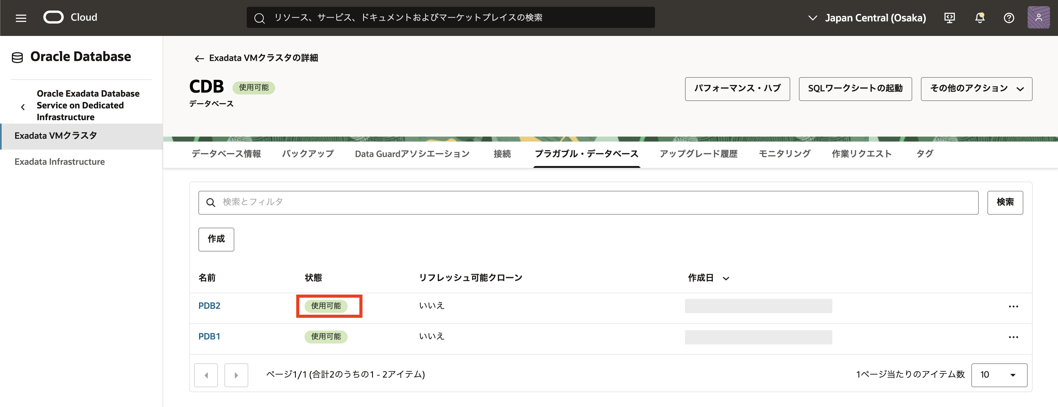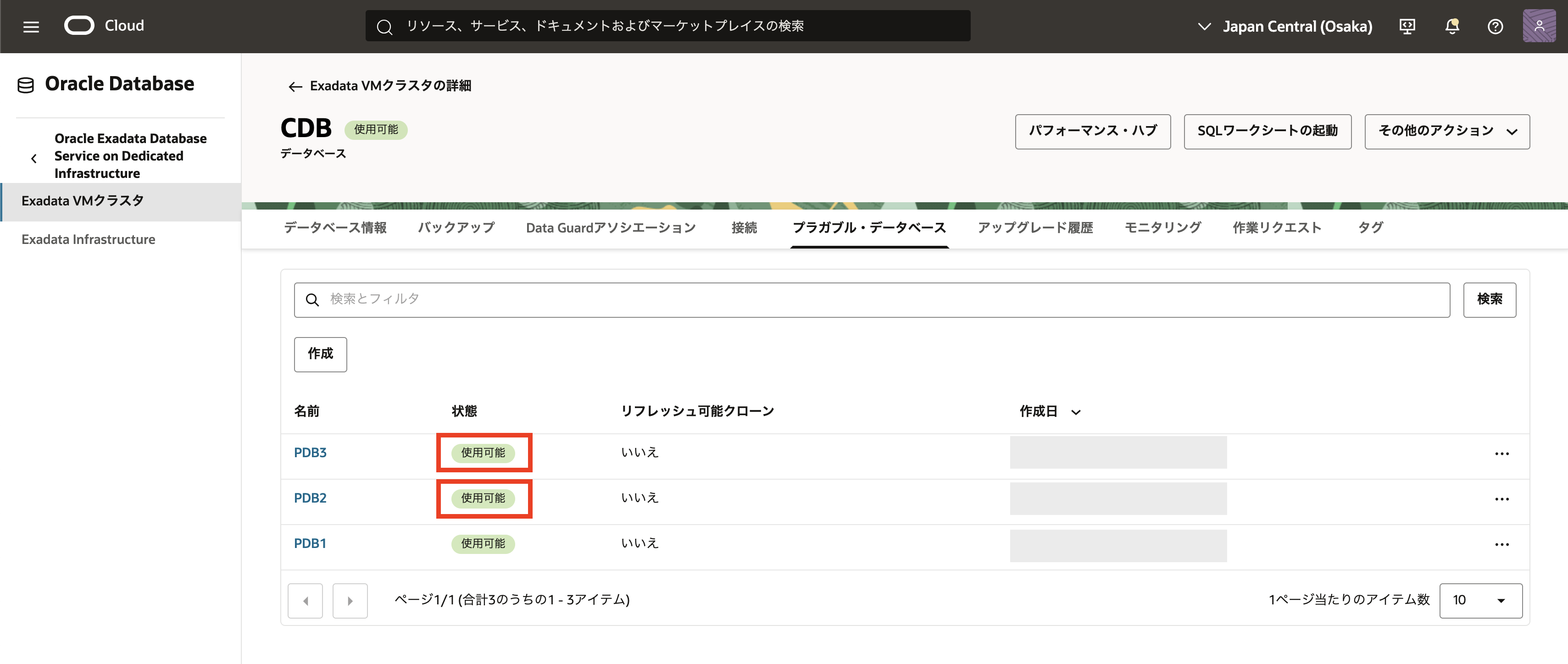 - 作成が完了すると作成した PDB の状態が使用可能と表示されます。