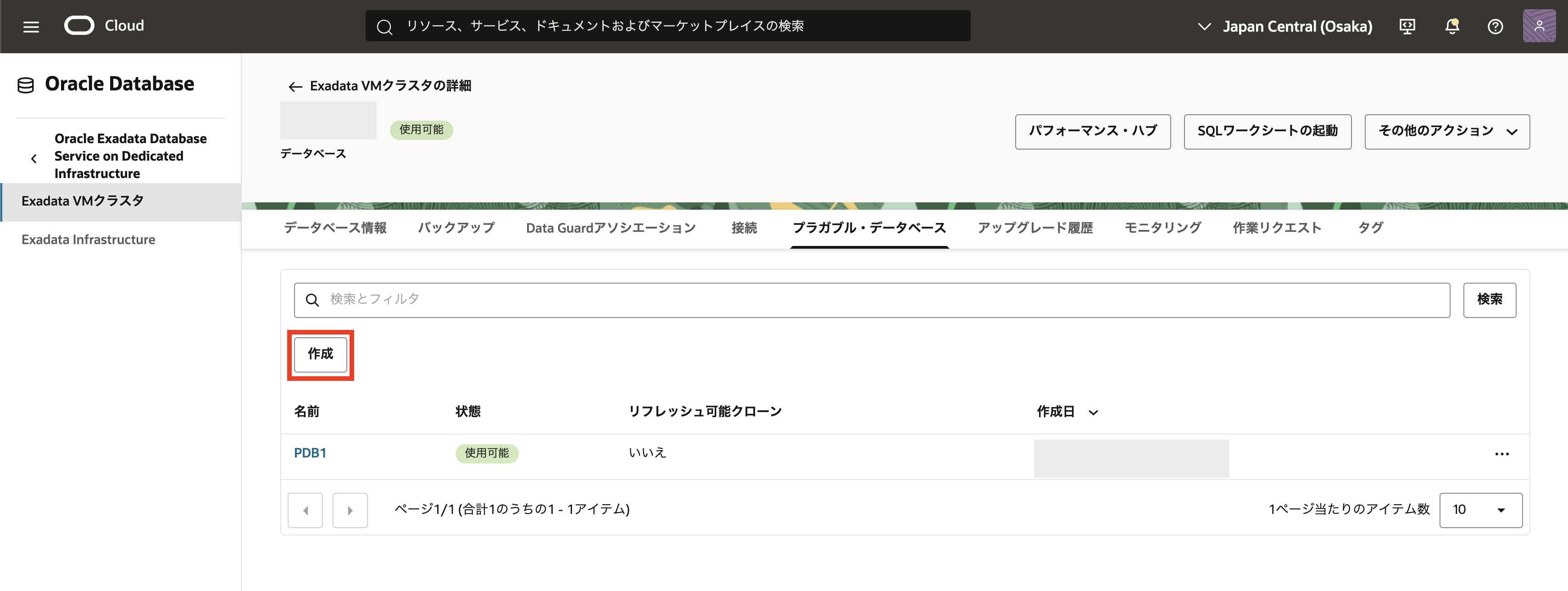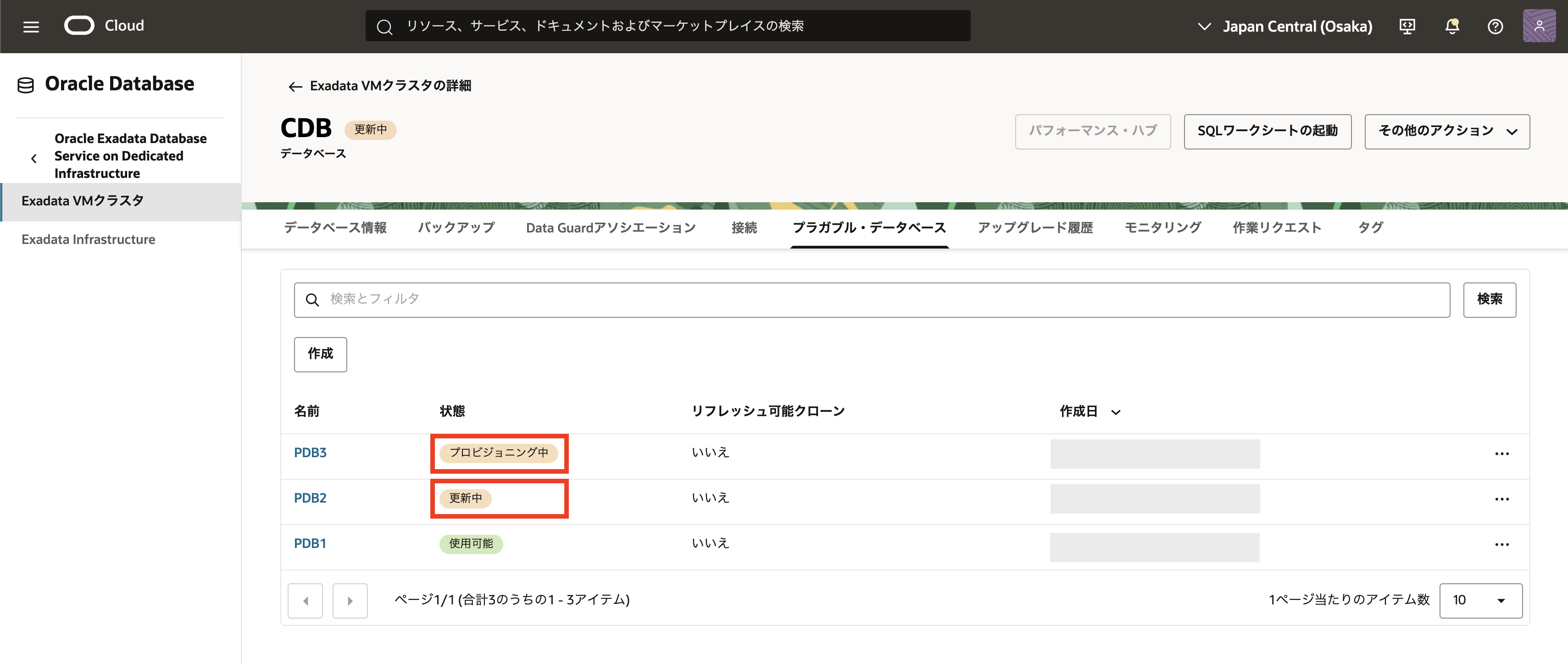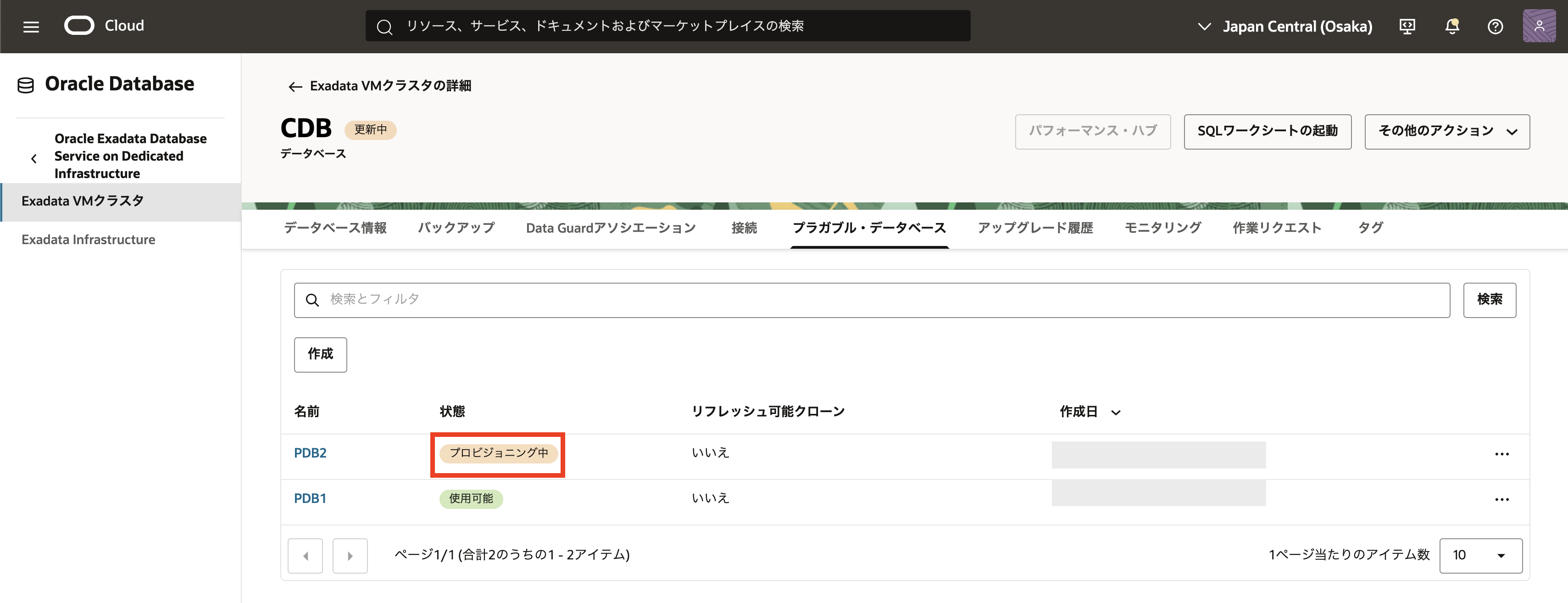 - 作成が完了すると作成した PDB の状態が使用可能と表示されます。
