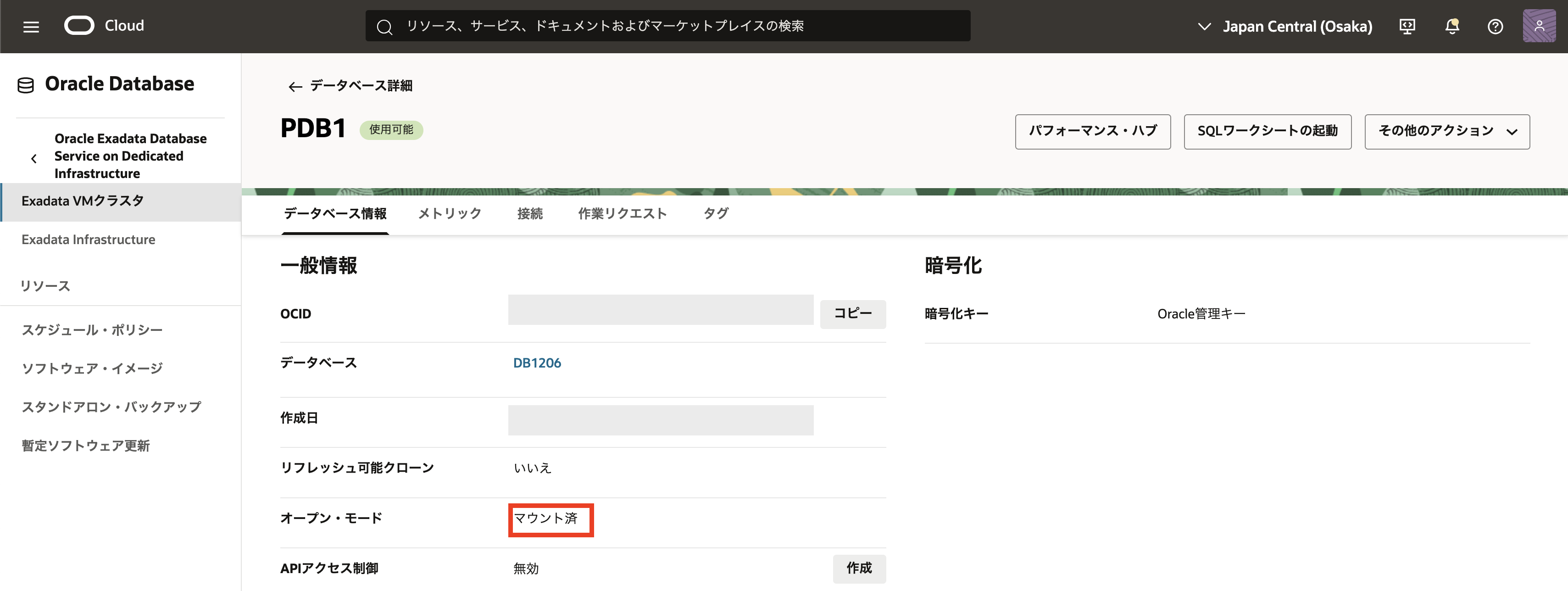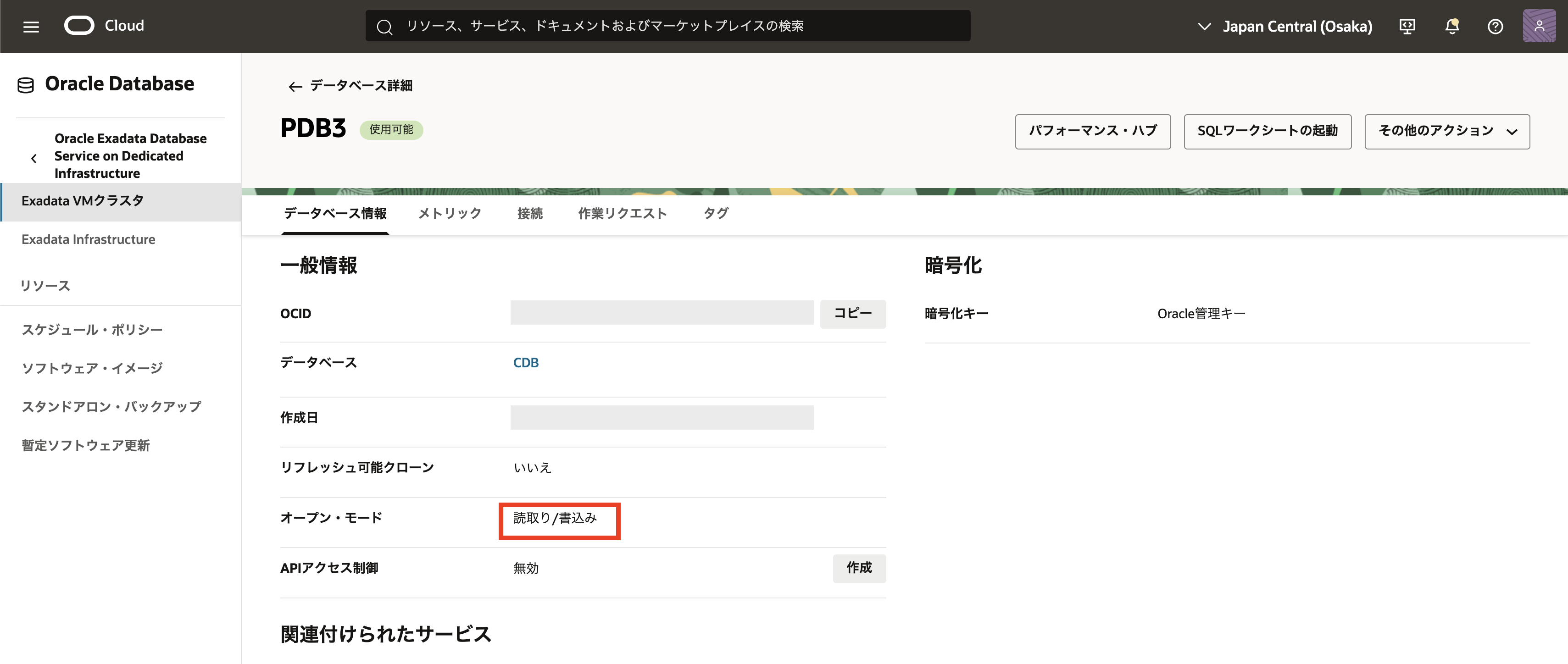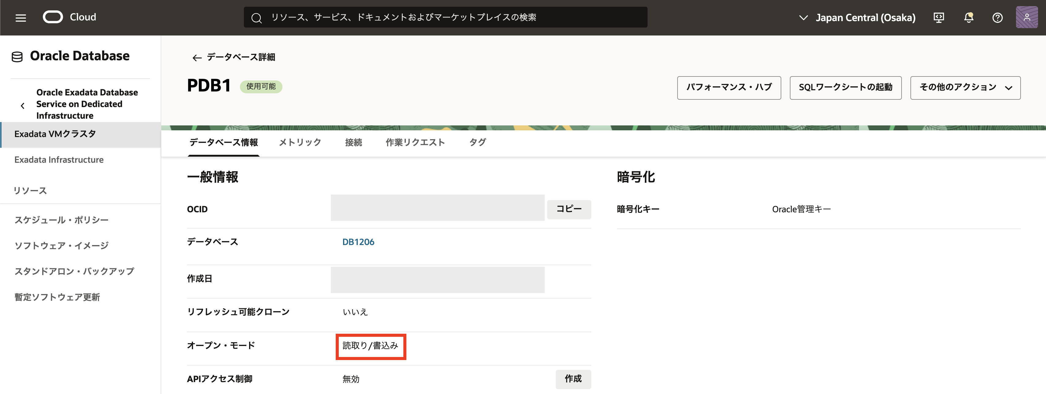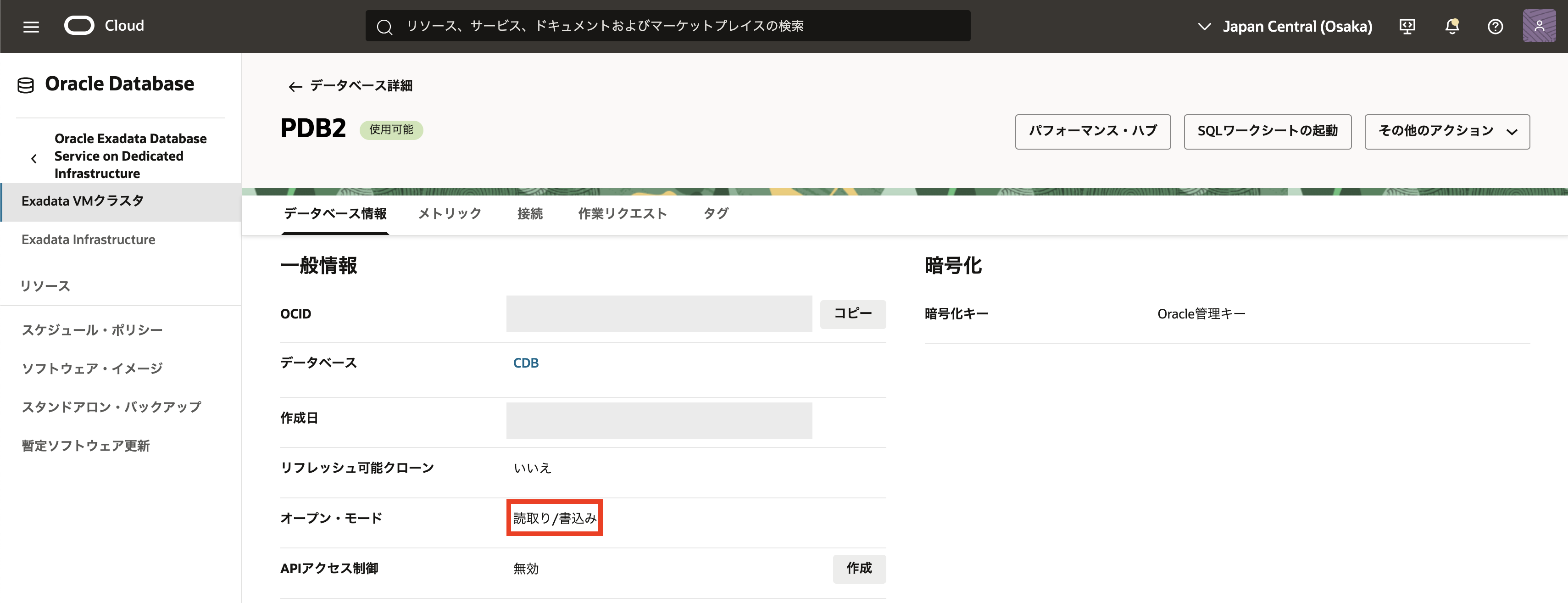 対象 PDB の プラガブル・データベースの詳細 でオープン・モードが 読み取り/書込み となっていることを確認します。
