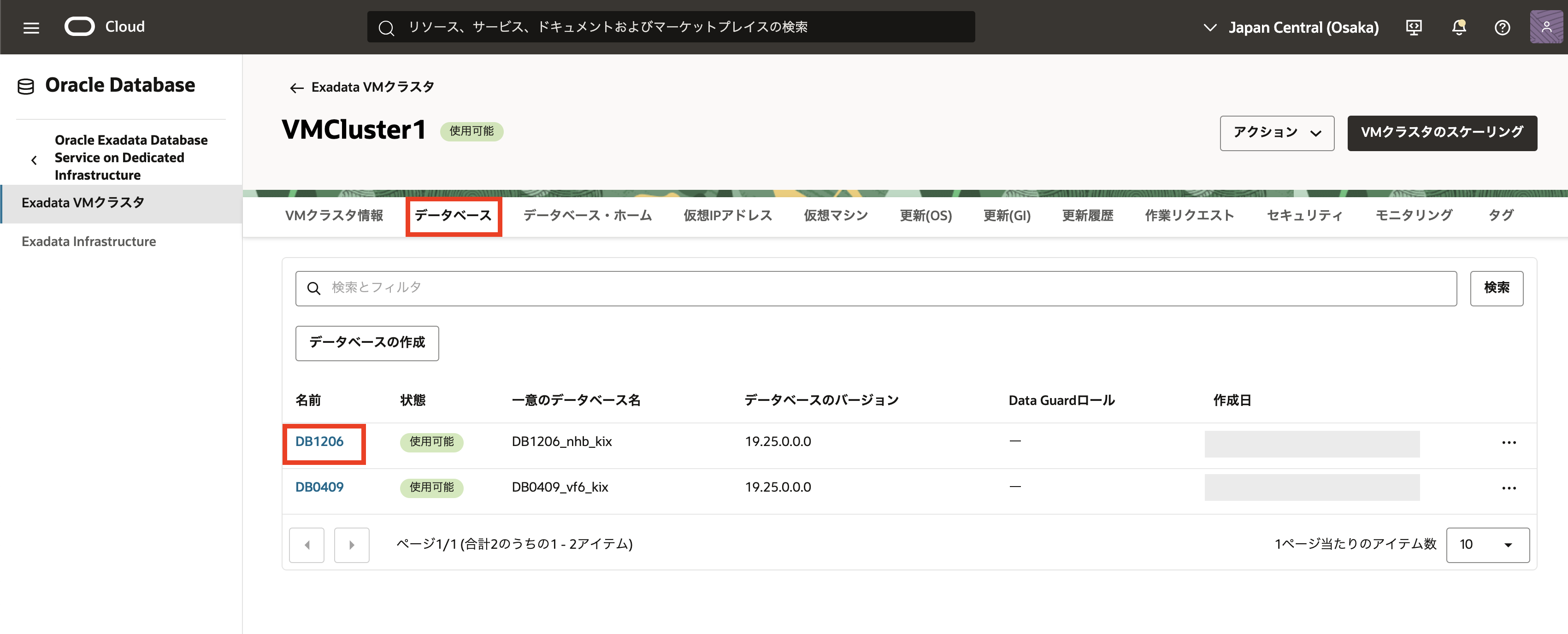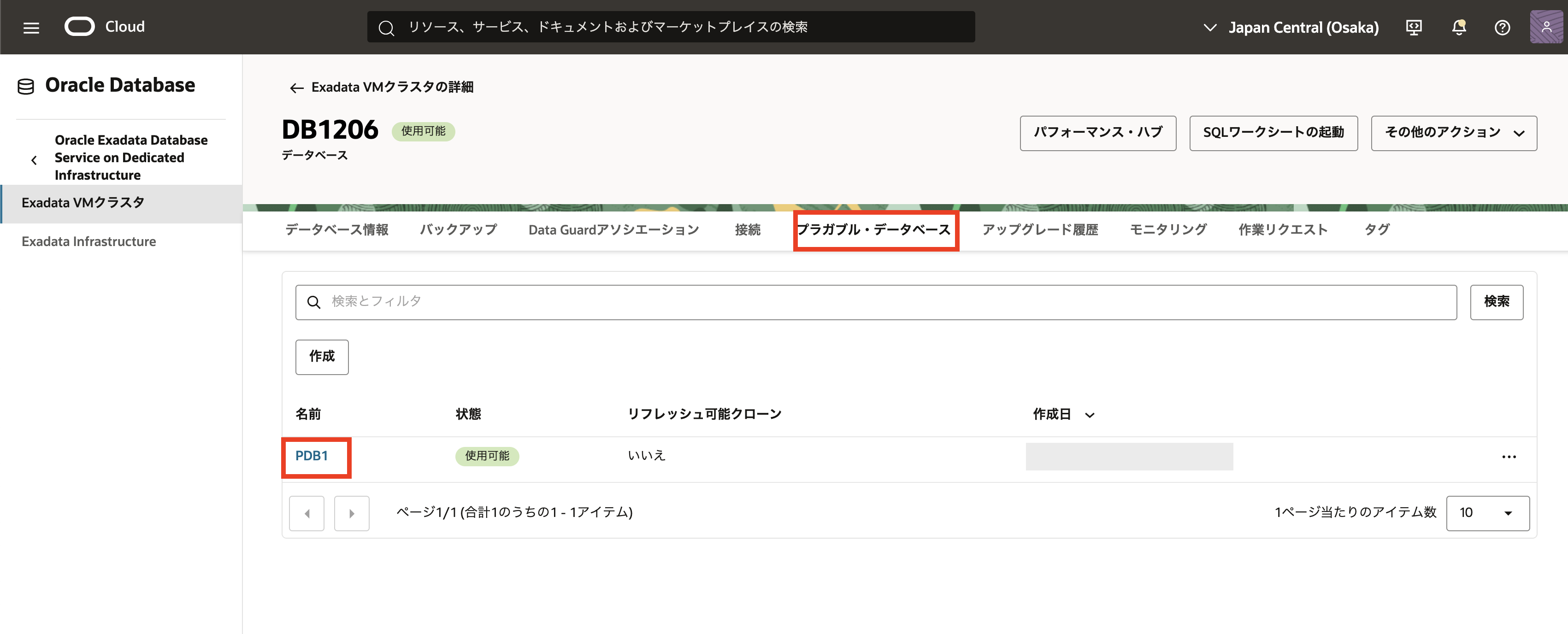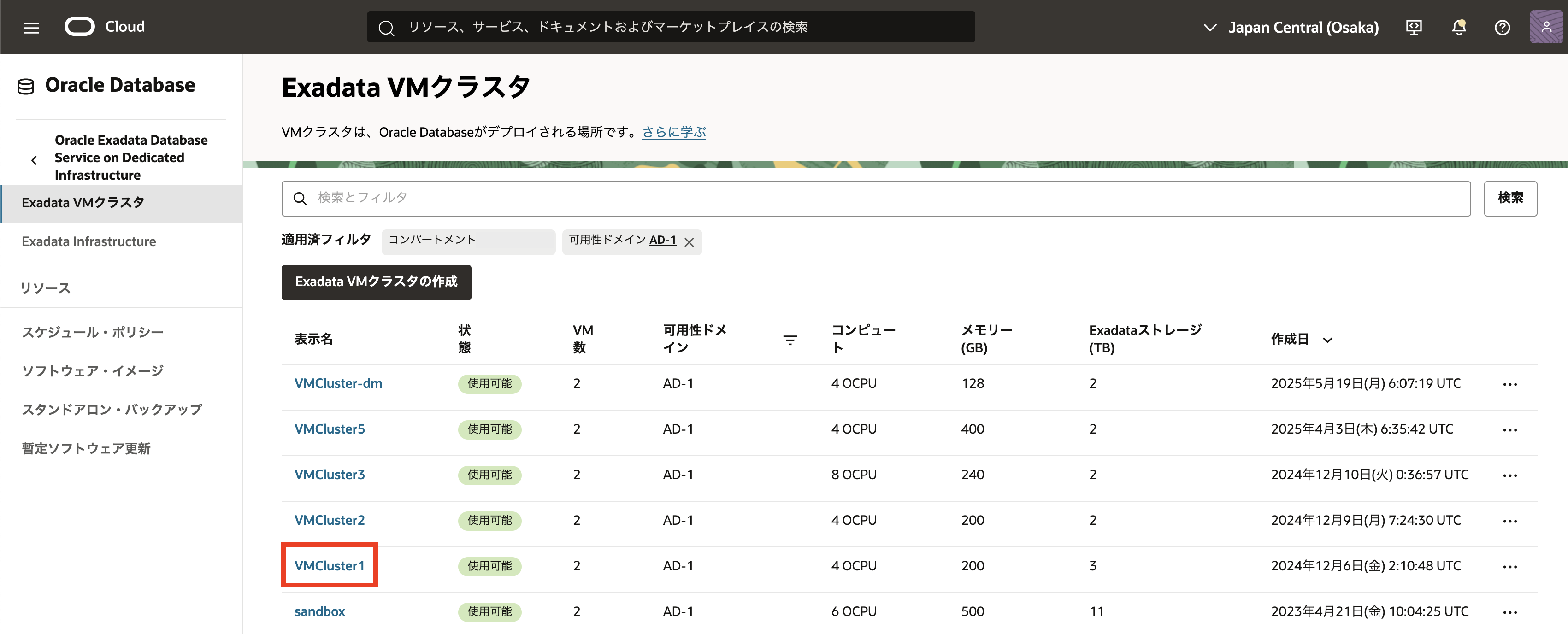 - 操作したい PDB を持つExadata VM クラスタの表示名をクリックします。