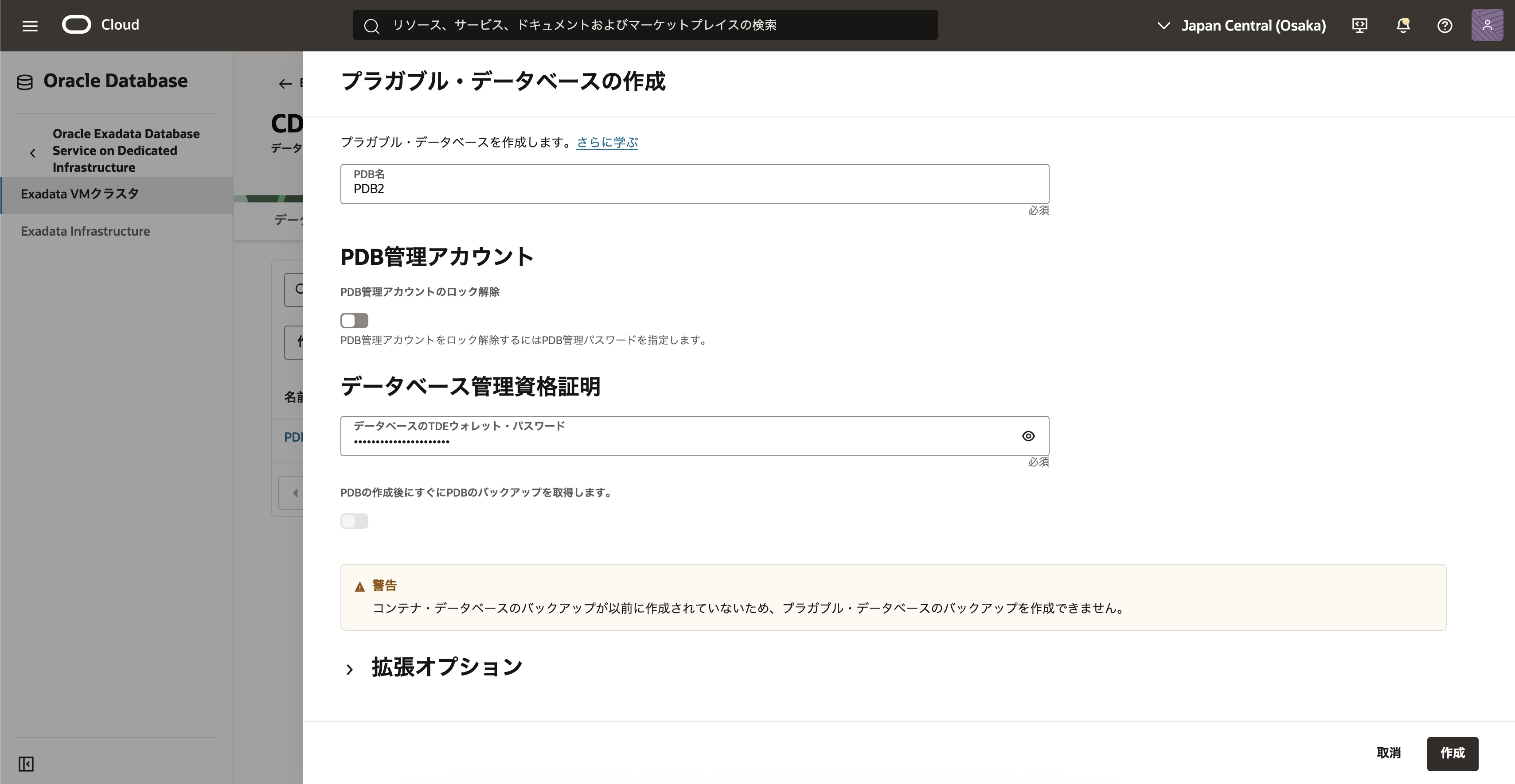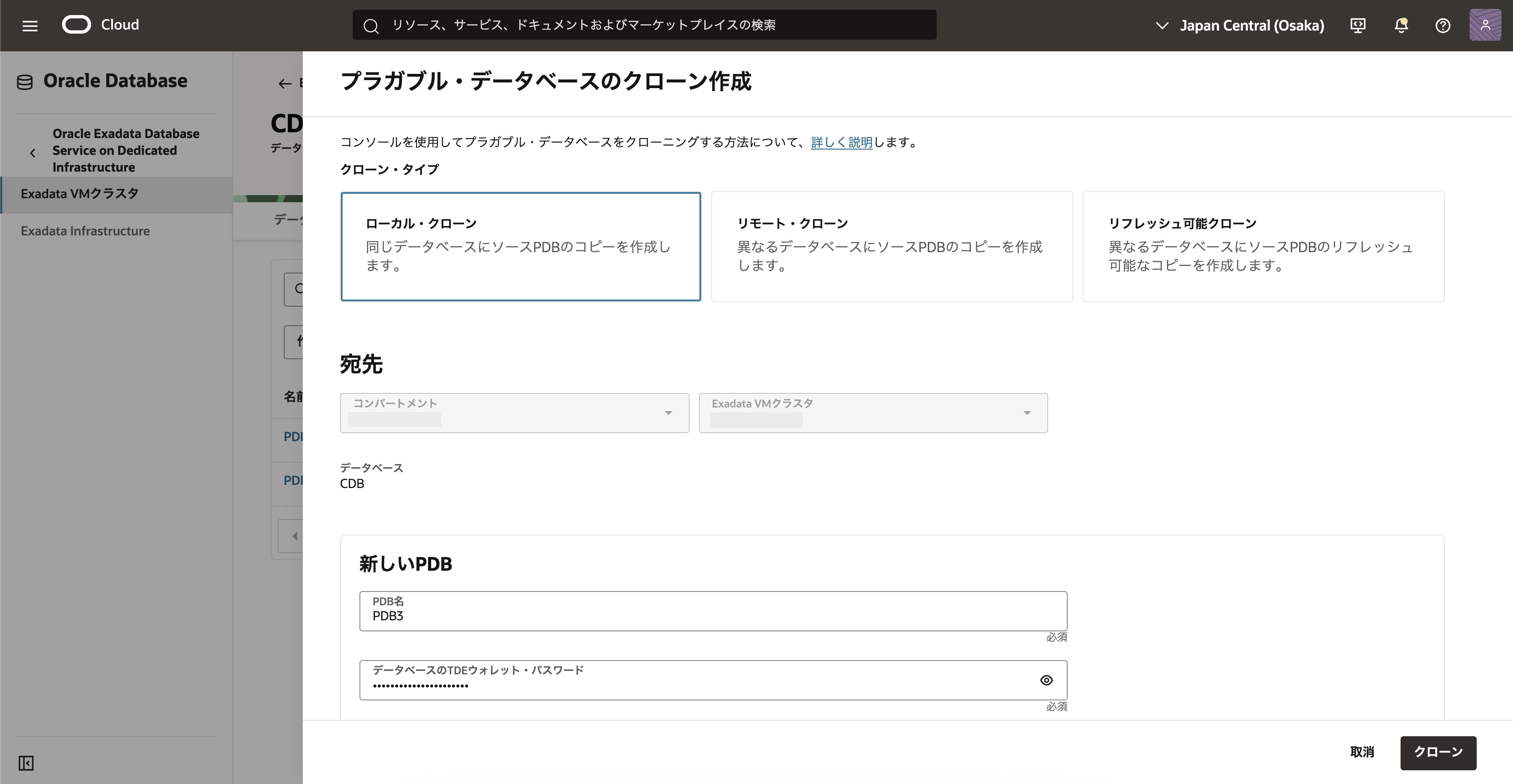 - ソース・データベースの管理パスワード - 本ガイドのようにローカルの CDB に作成する場合は入力不要です。リモートの CDB に作成する場合入力が必須となります。データベースを作成した際に設定した sys スキーマのパスワードです。101 : ExaDB-D を使おうの3. データベースの作成で設定したパスワードです。