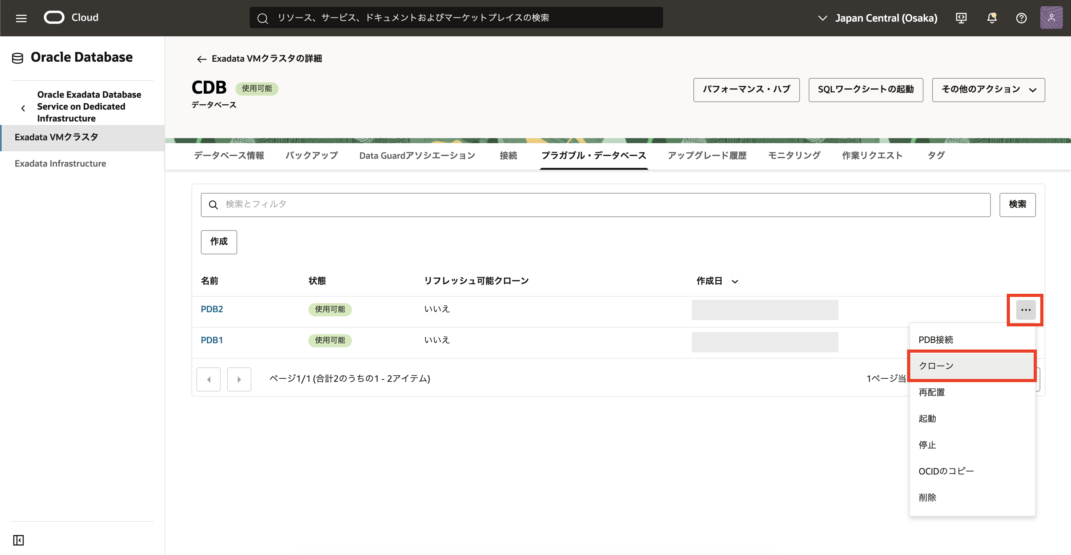 Oracle Cloud Infrastructure Exadata Database Service on Dedicated Infrastructure (ExaDB-D) では、OCI 上で稼働する Oracle Database の PDB を OCI コンソールから停止や起動、クローン作成など簡単に操作できます。この章では実際の操作手順を確認します。