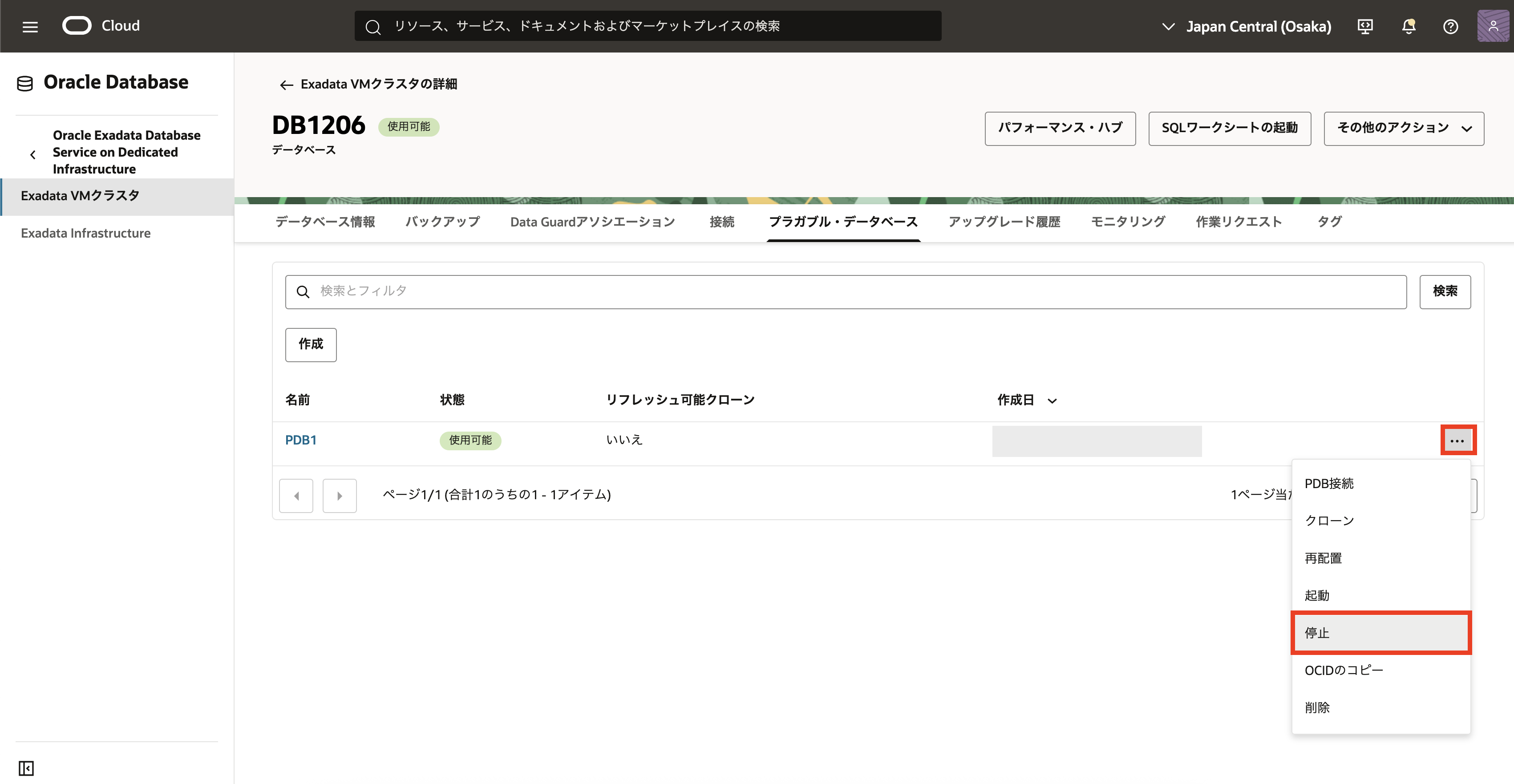 操作したい PDB の右側「・・・」メニューをクリックし、停止を選択します。
